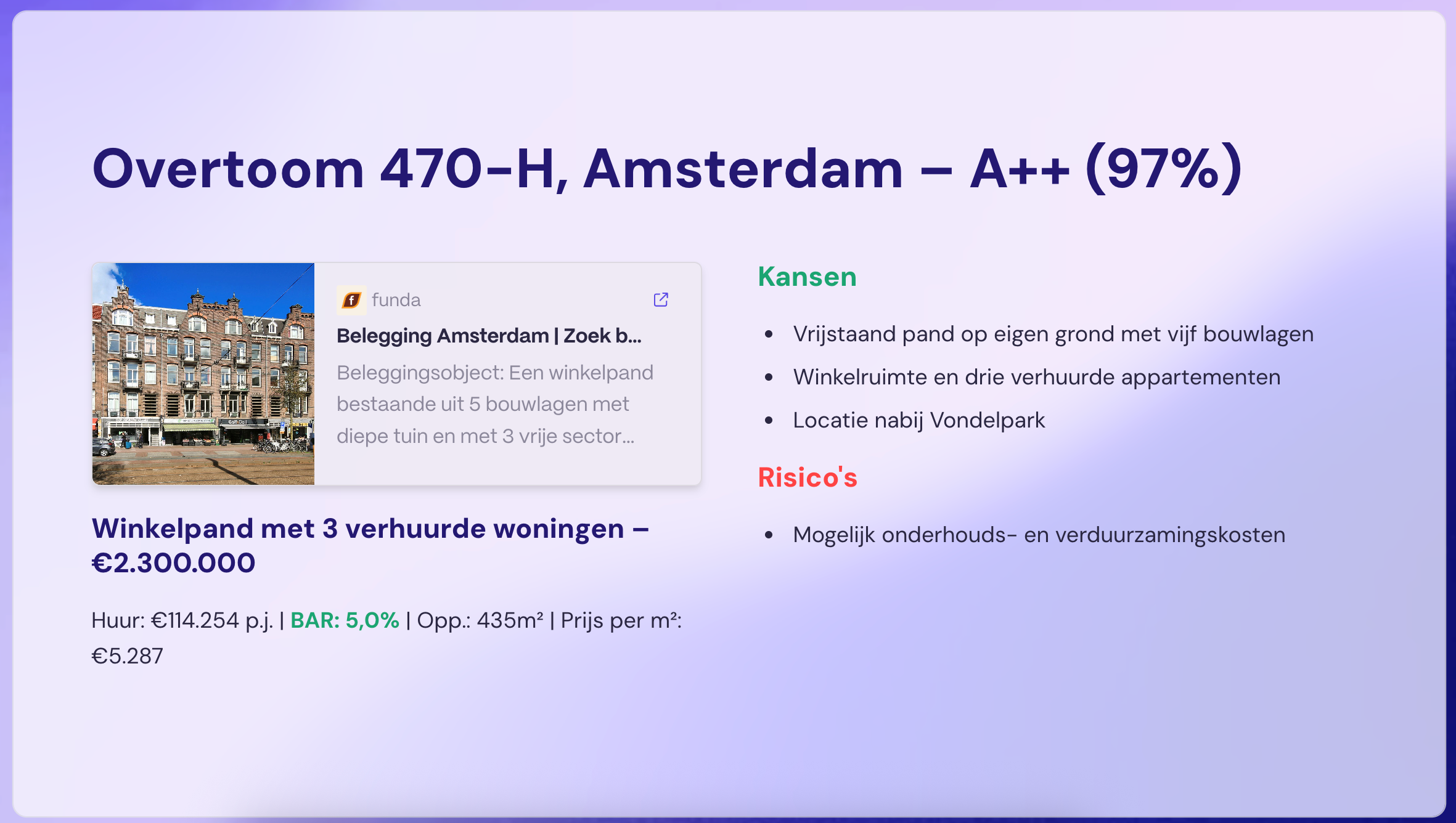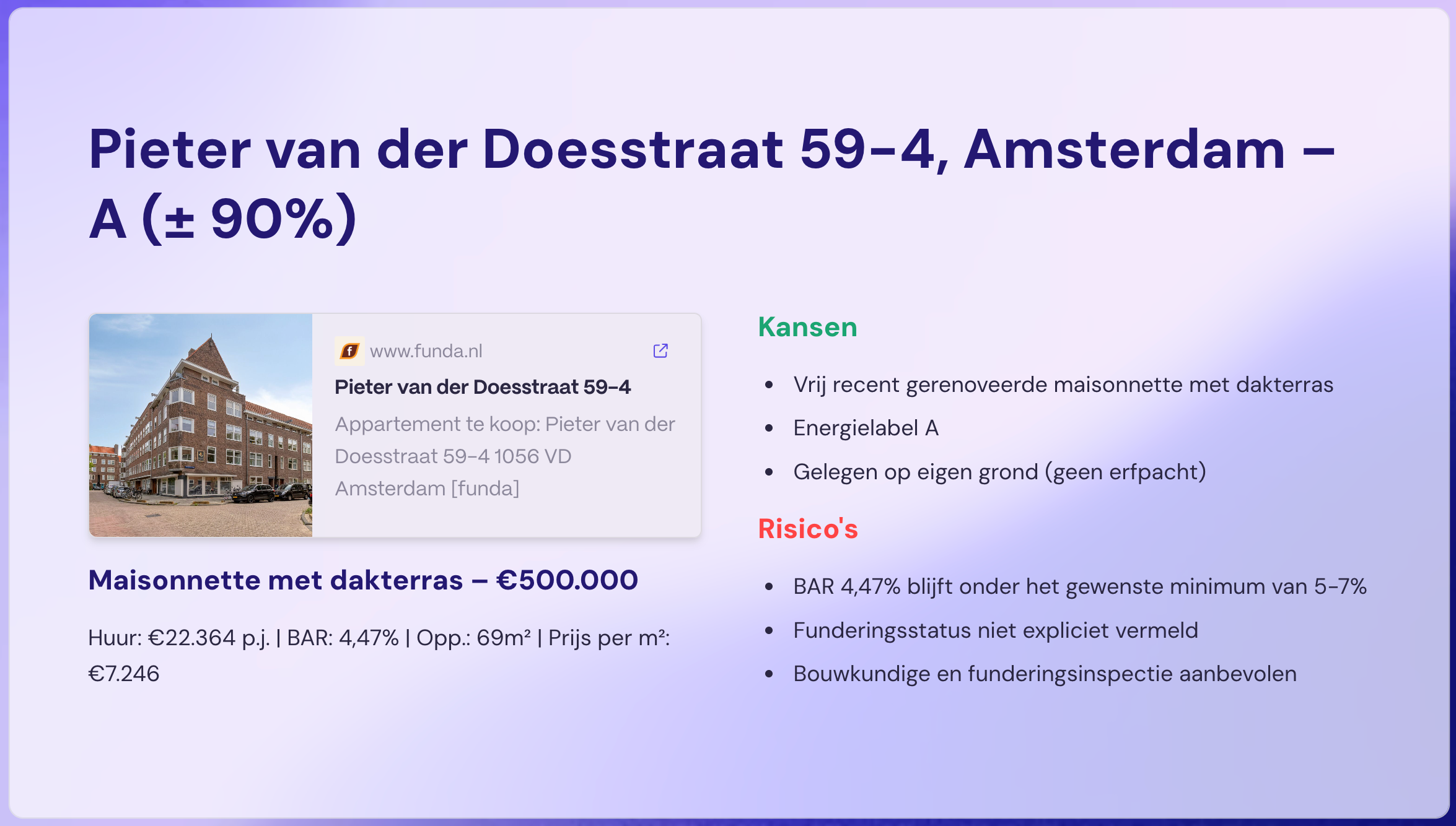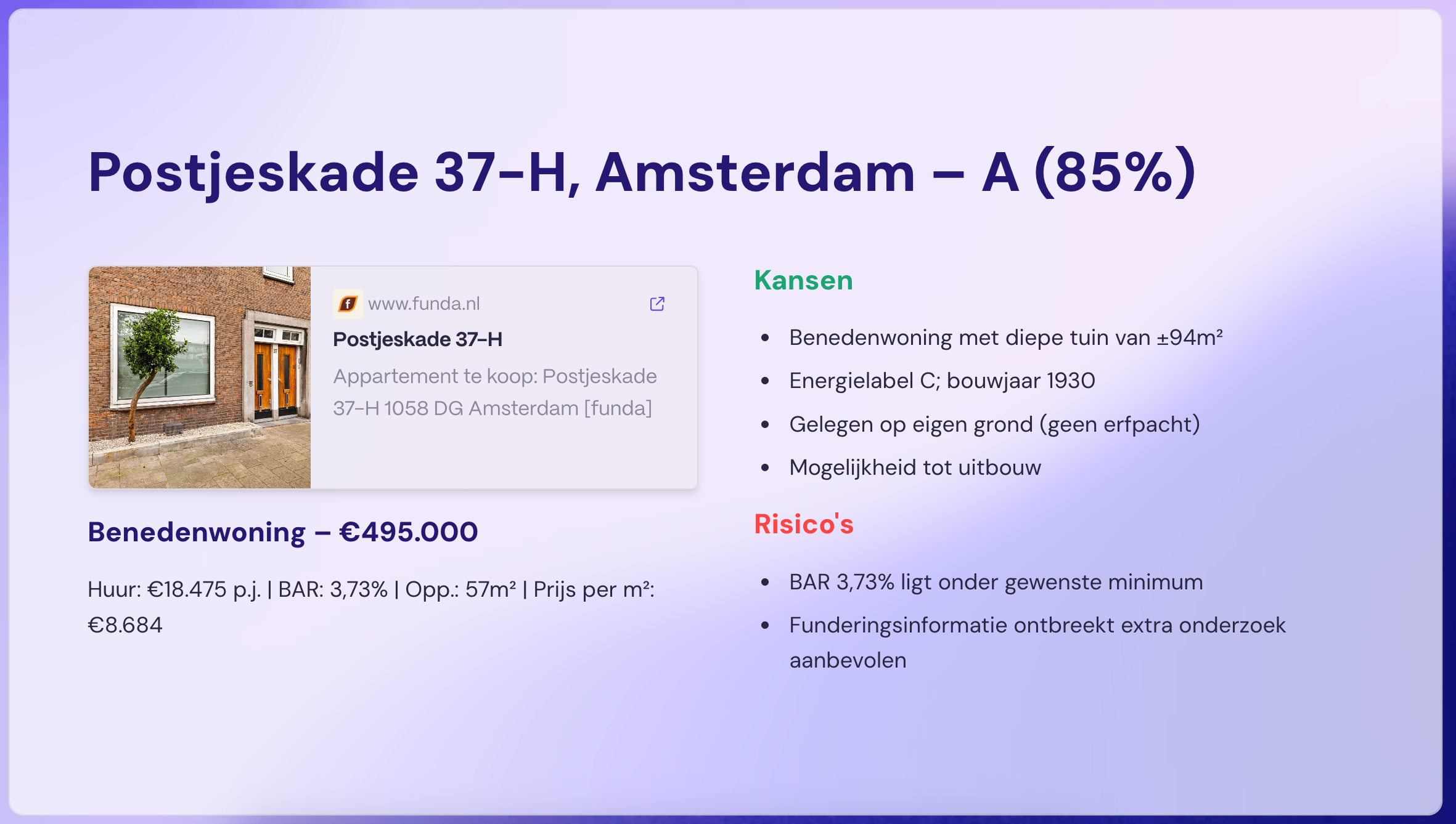 Binnen 24 uur in je inbox: een overzicht met BAR, factor, huur, risico-analyse en advies.