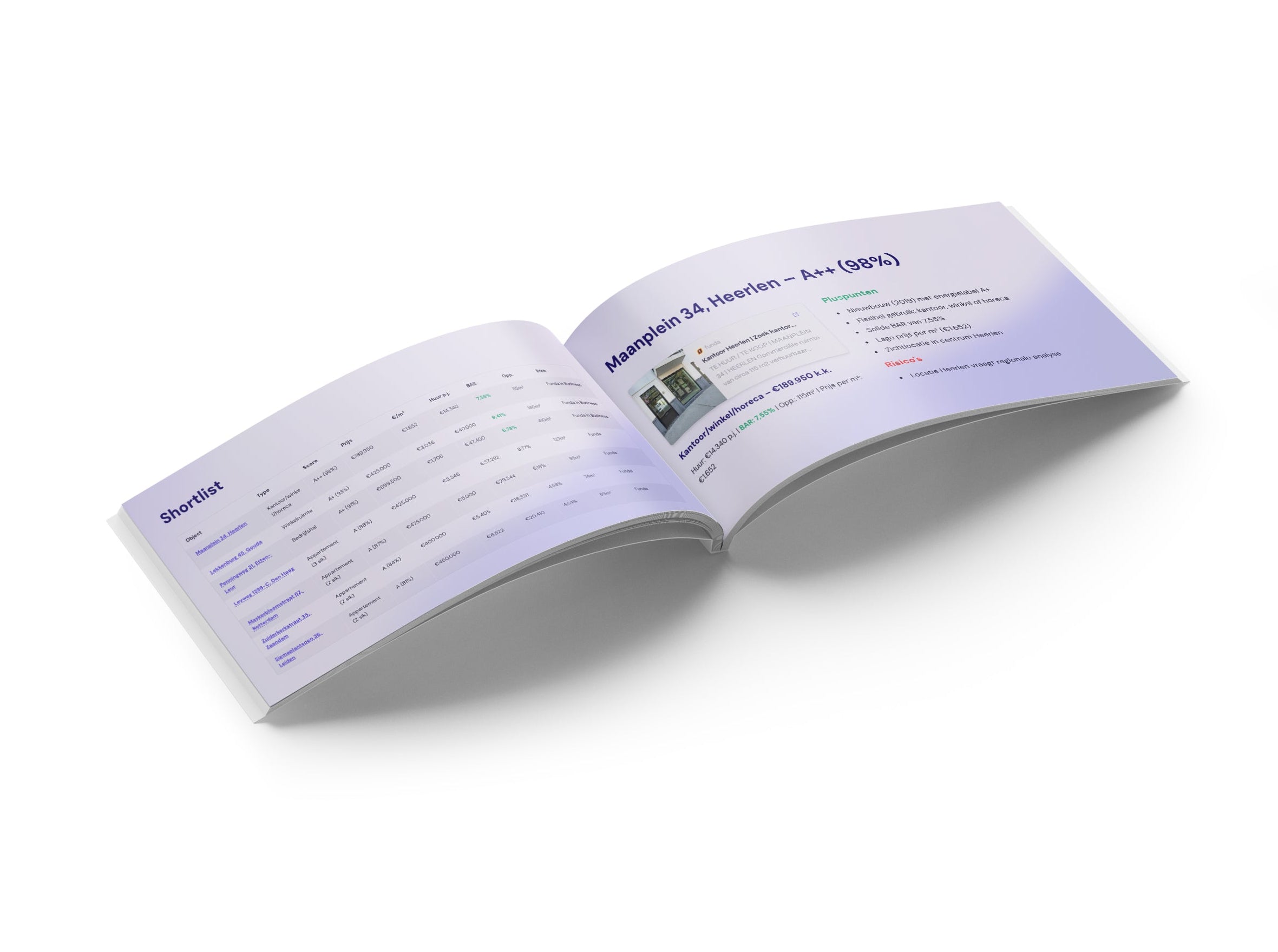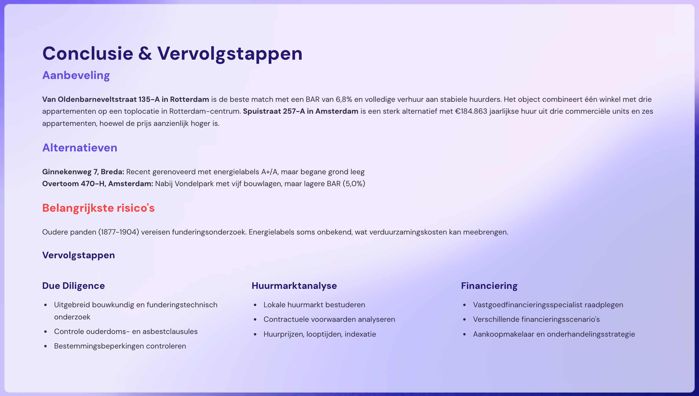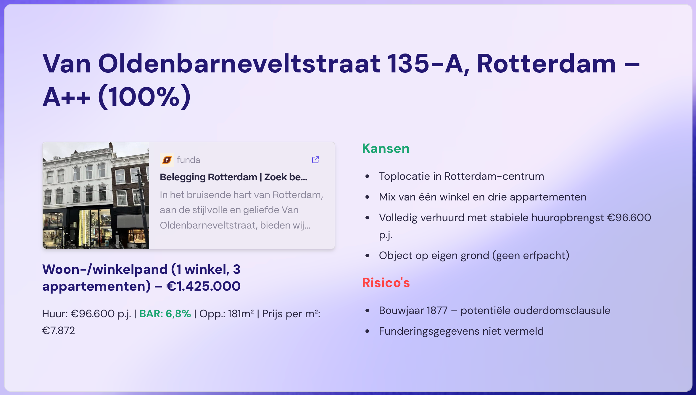 Binnen 24 uur in je inbox: een overzicht met BAR, factor, huur, risico-analyse en advies.