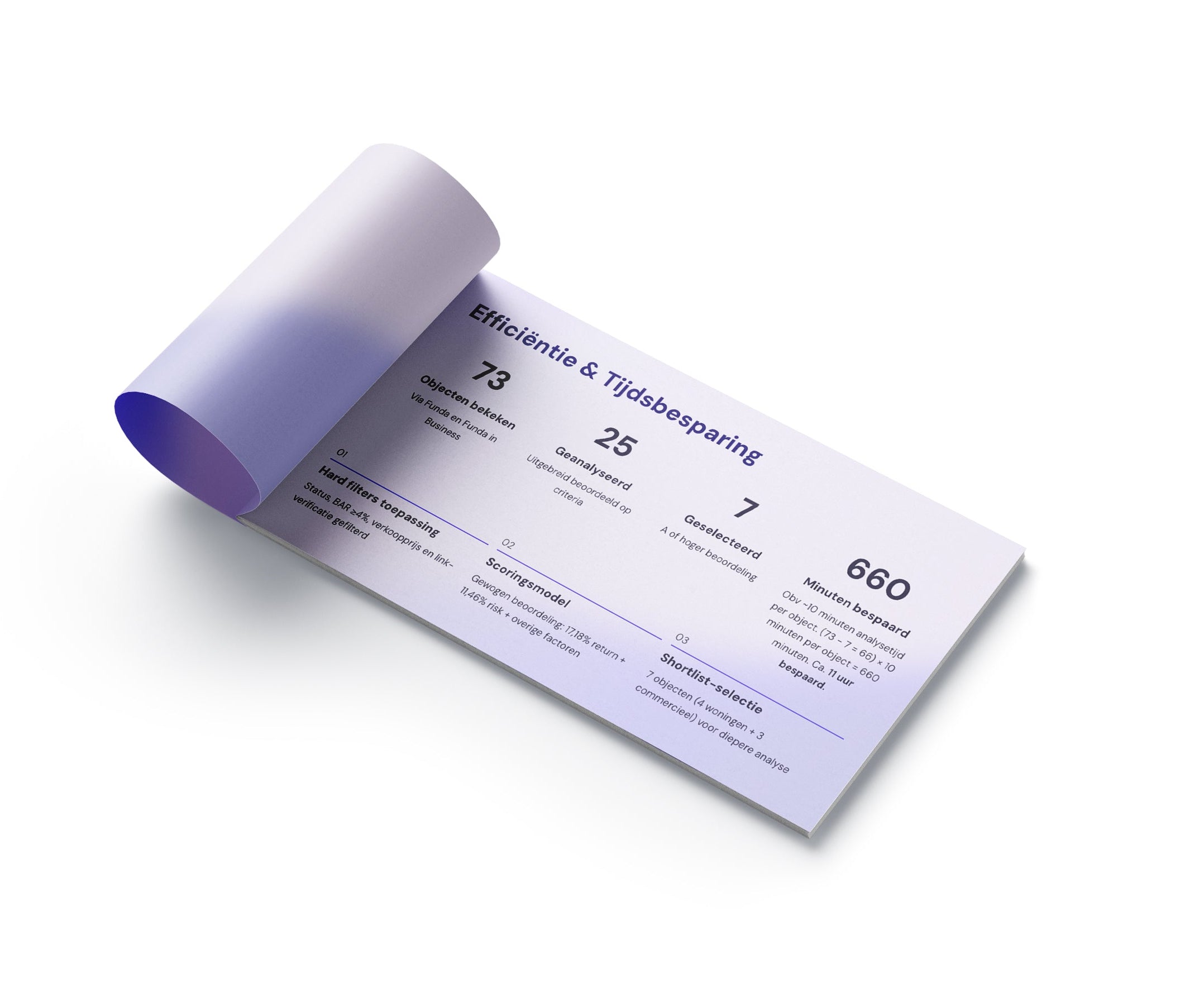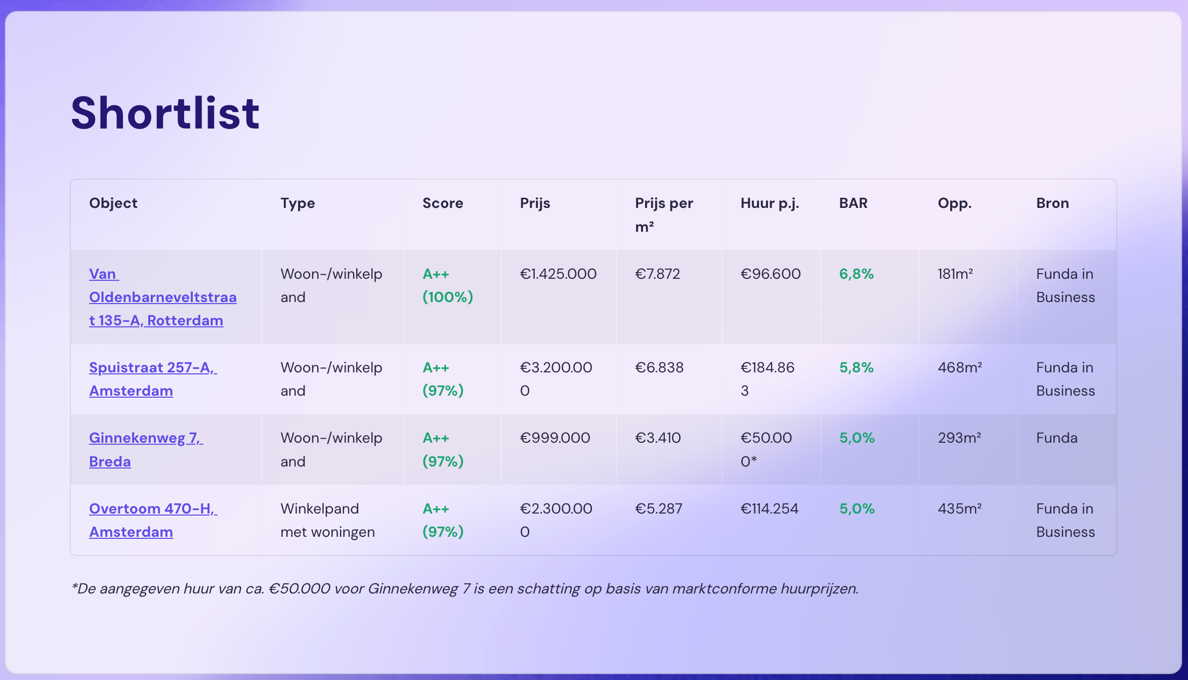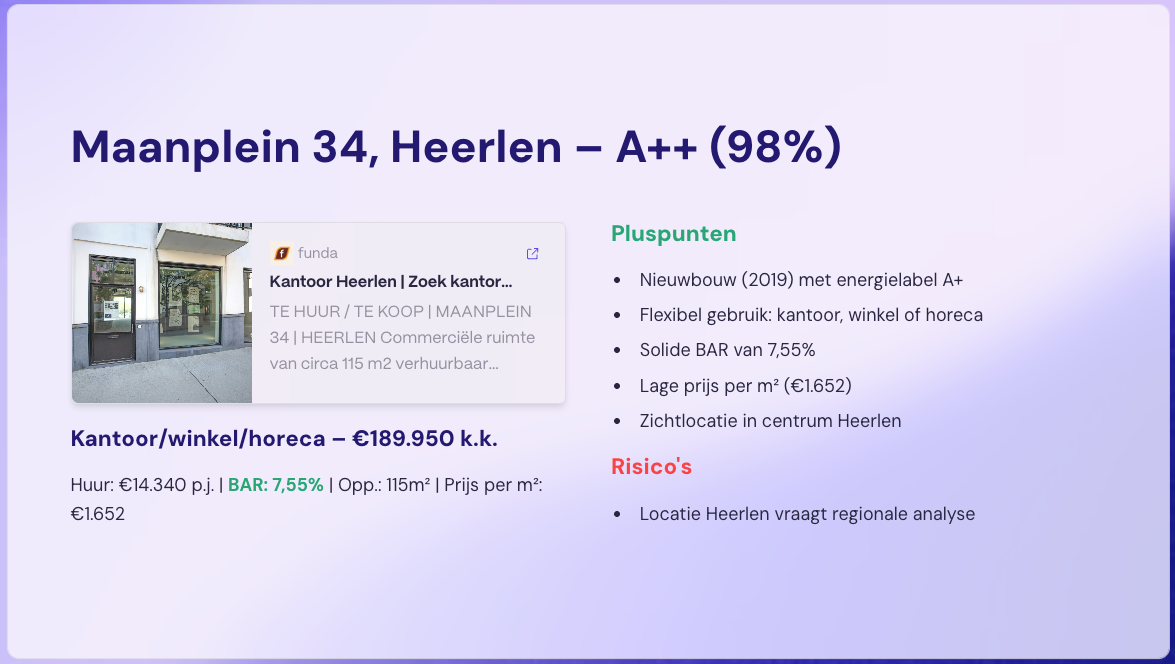 Wij analyseren dagelijks het landelijke aanbod. Alleen objecten die voldoen aan jouw criteria (zoals, BAR, factor, huur, erfpacht, risico’s) komen in de shortlist.
