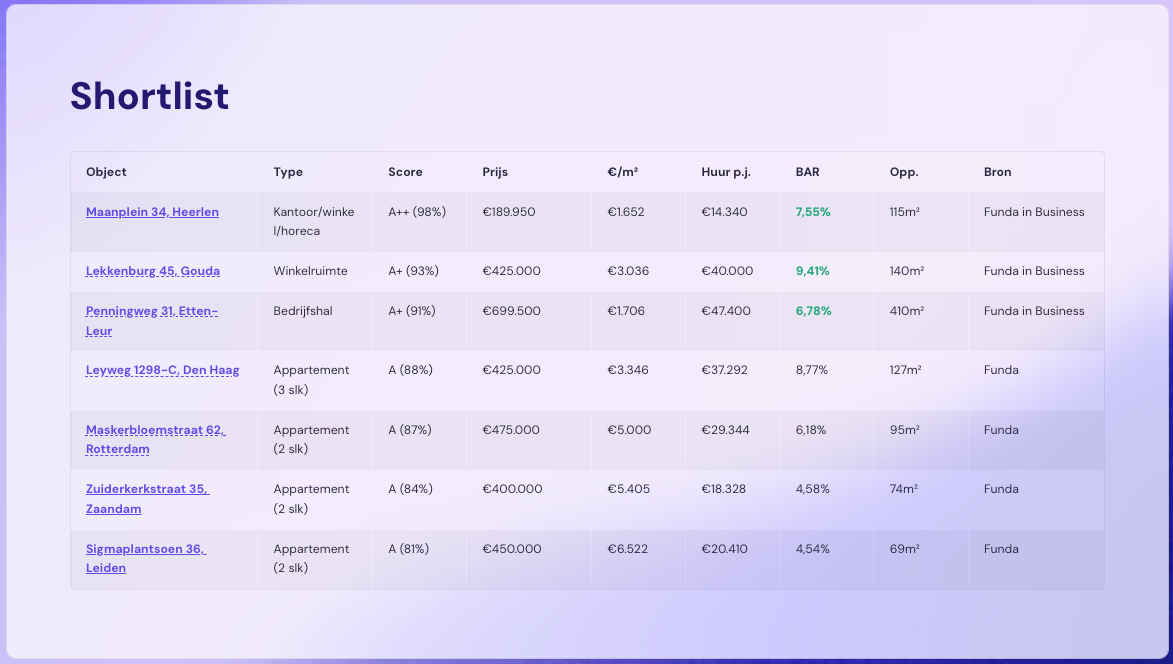 Ja. Onze selectie omvat woningen, winkels én garageboxen. Allemaal op basis van jouw voorkeuren. Juist de mix maakt de shortlist interessant, omdat je ook toegang krijgt tot niches met vaak hogere rendementen.