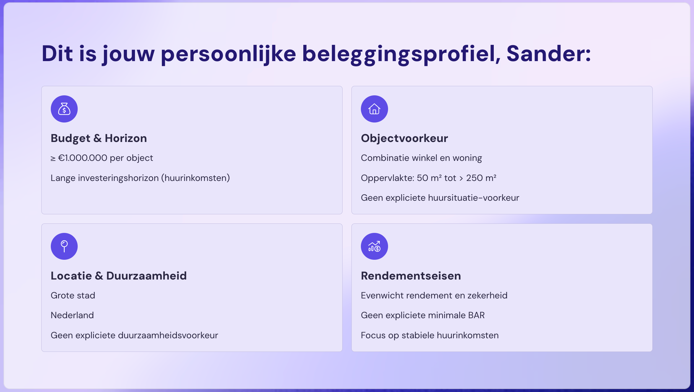 Elke rapport wordt afgestemd op jouw voorkeuren: regio, budget, type object en risicoprofiel. Je ontvangt dus geen bulk, maar een persoonlijke selectie.