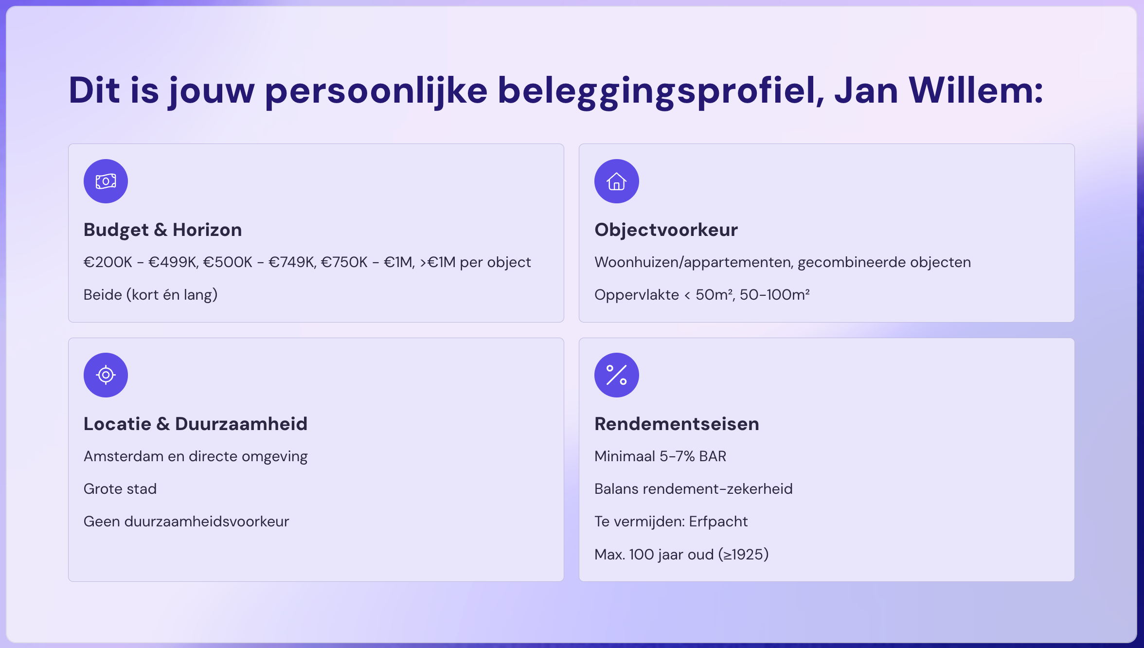 Geef aan wat je budget is, welk rendement je wilt en waar je wilt investeren.