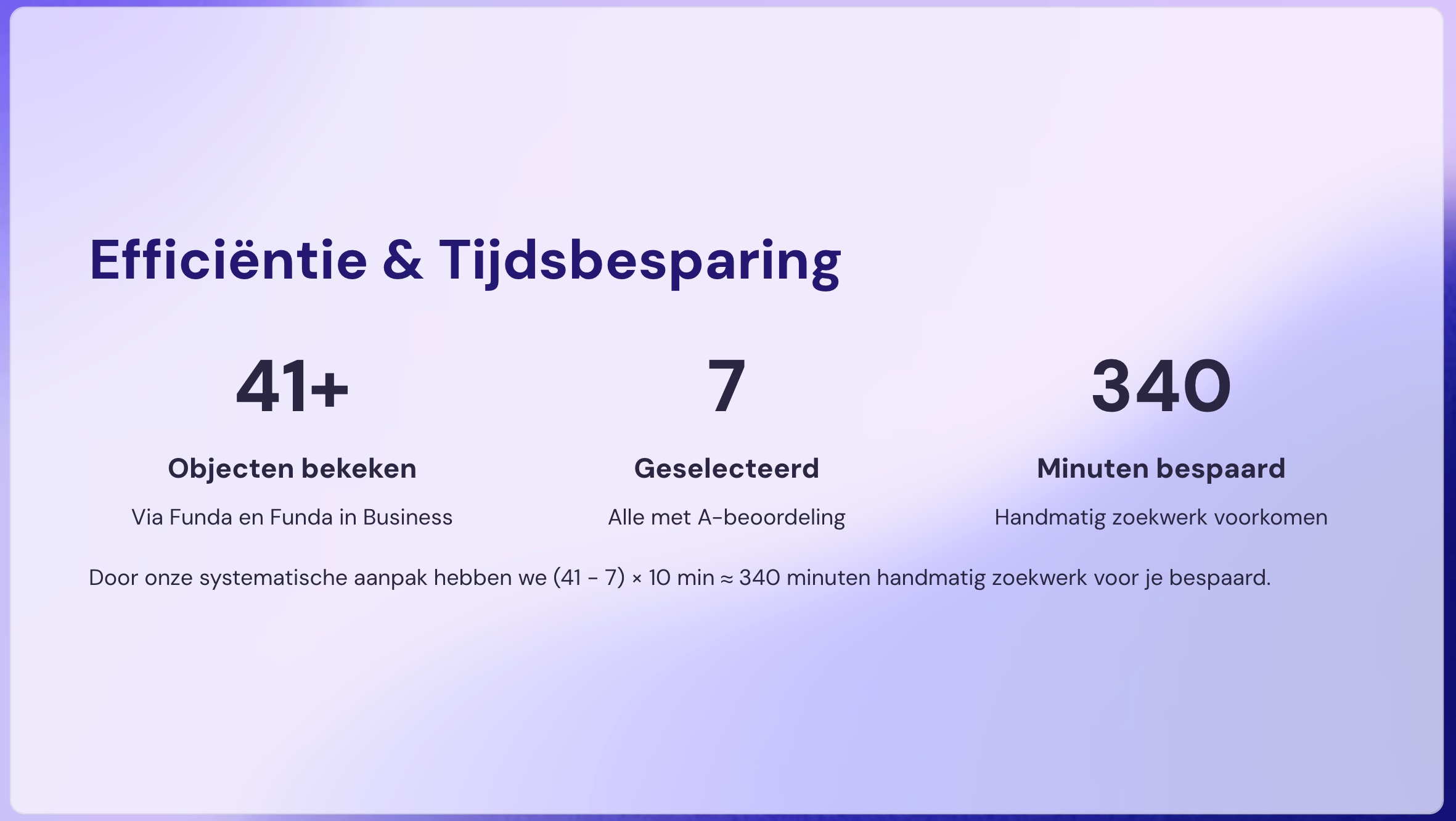 Zelf zoeken betekent uren scrollen en risico op fouten. Wij besparen je gemiddeld 5–10 uur per maand en geven je direct inzicht in kansen én valkuilen, zodat je sneller en beter beslist.